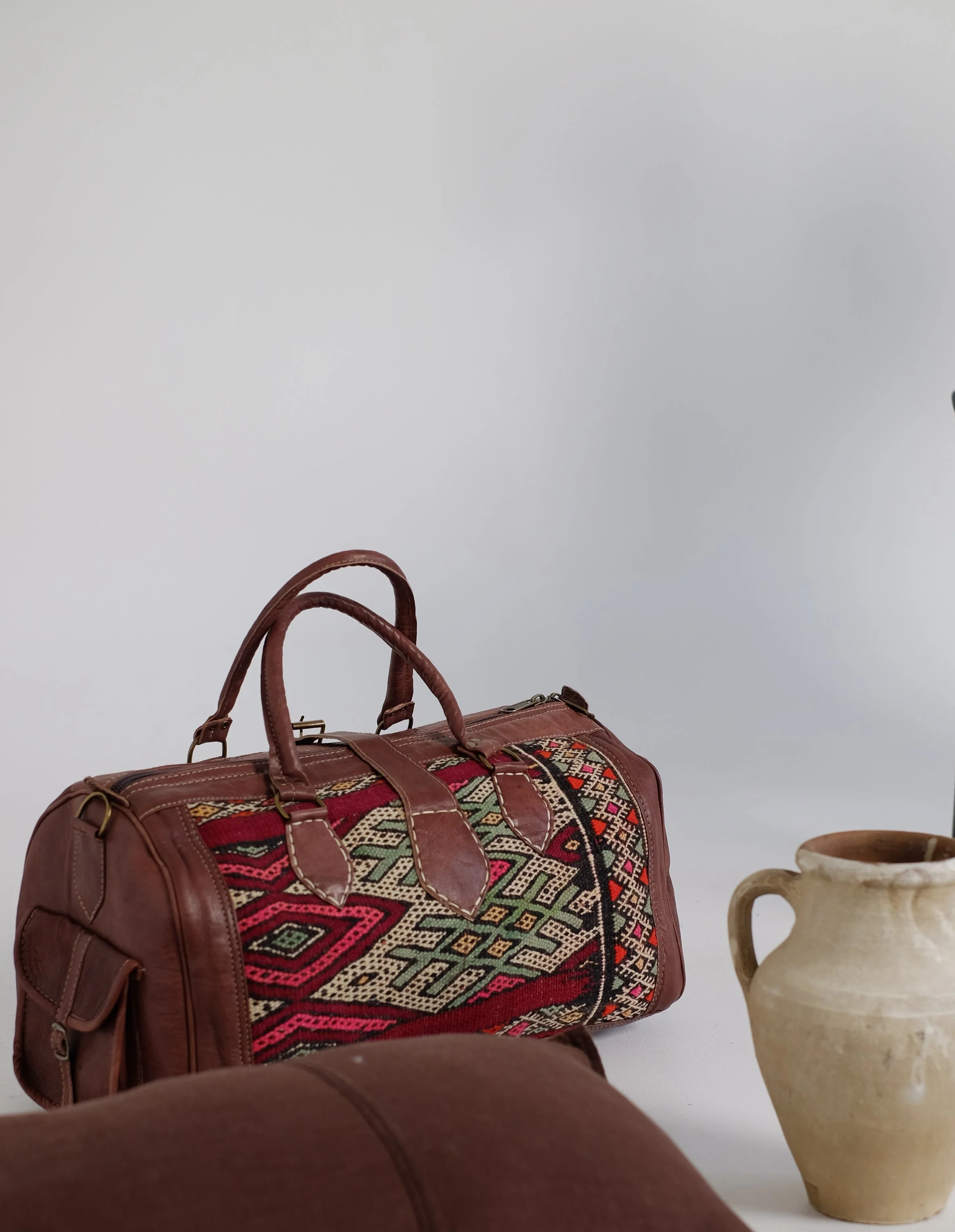 Handmade using up-cycled Moroccan Rugs and premium Vintage Leather- our weekender Bags are perfect for a weekend away and all the essentials.