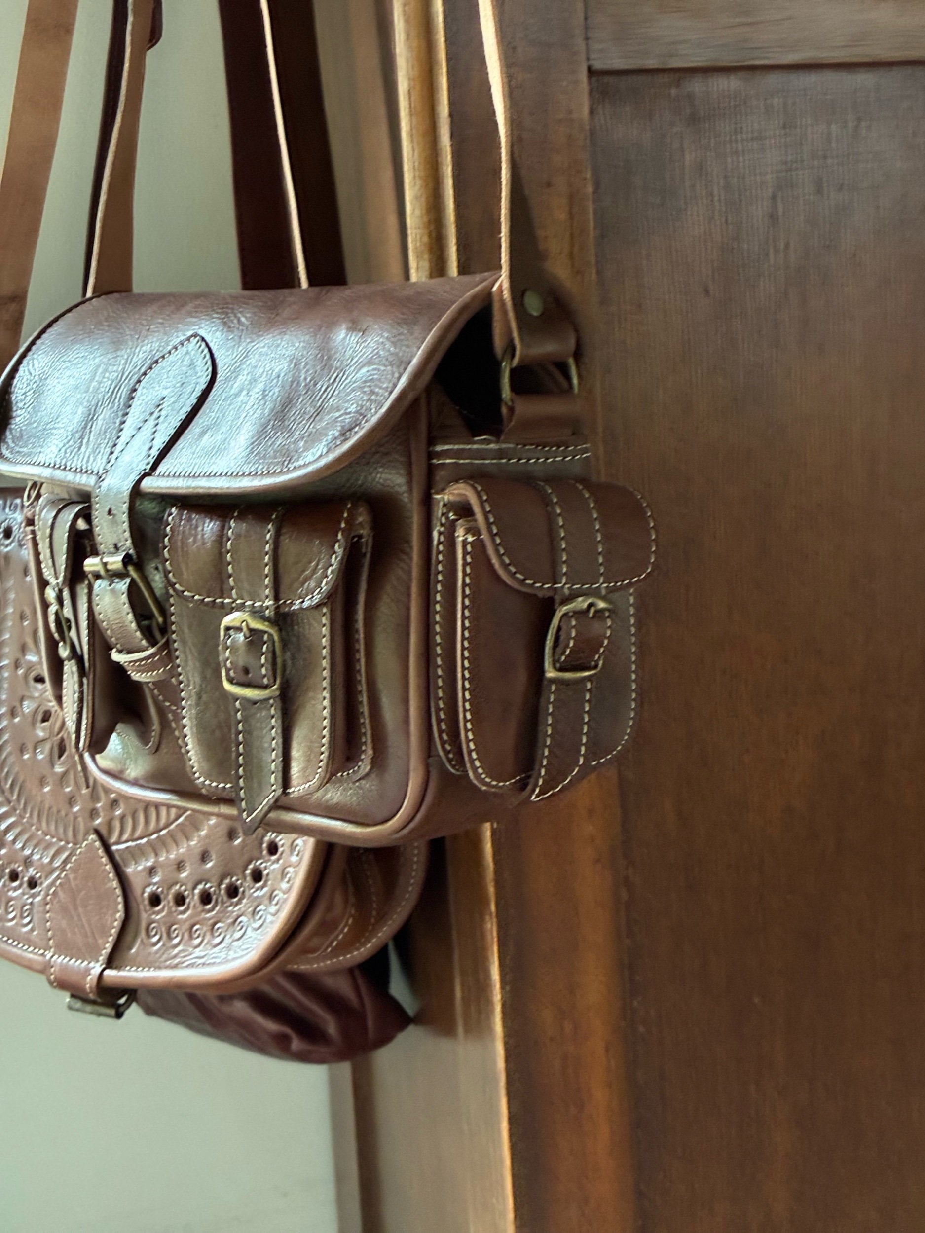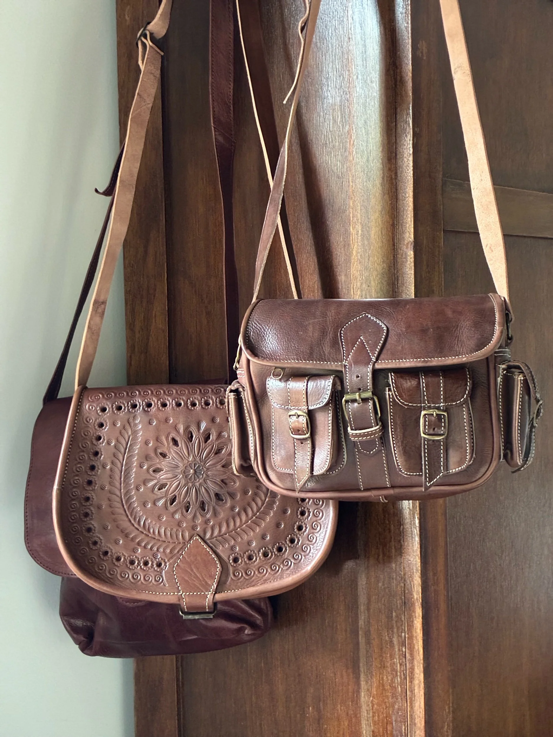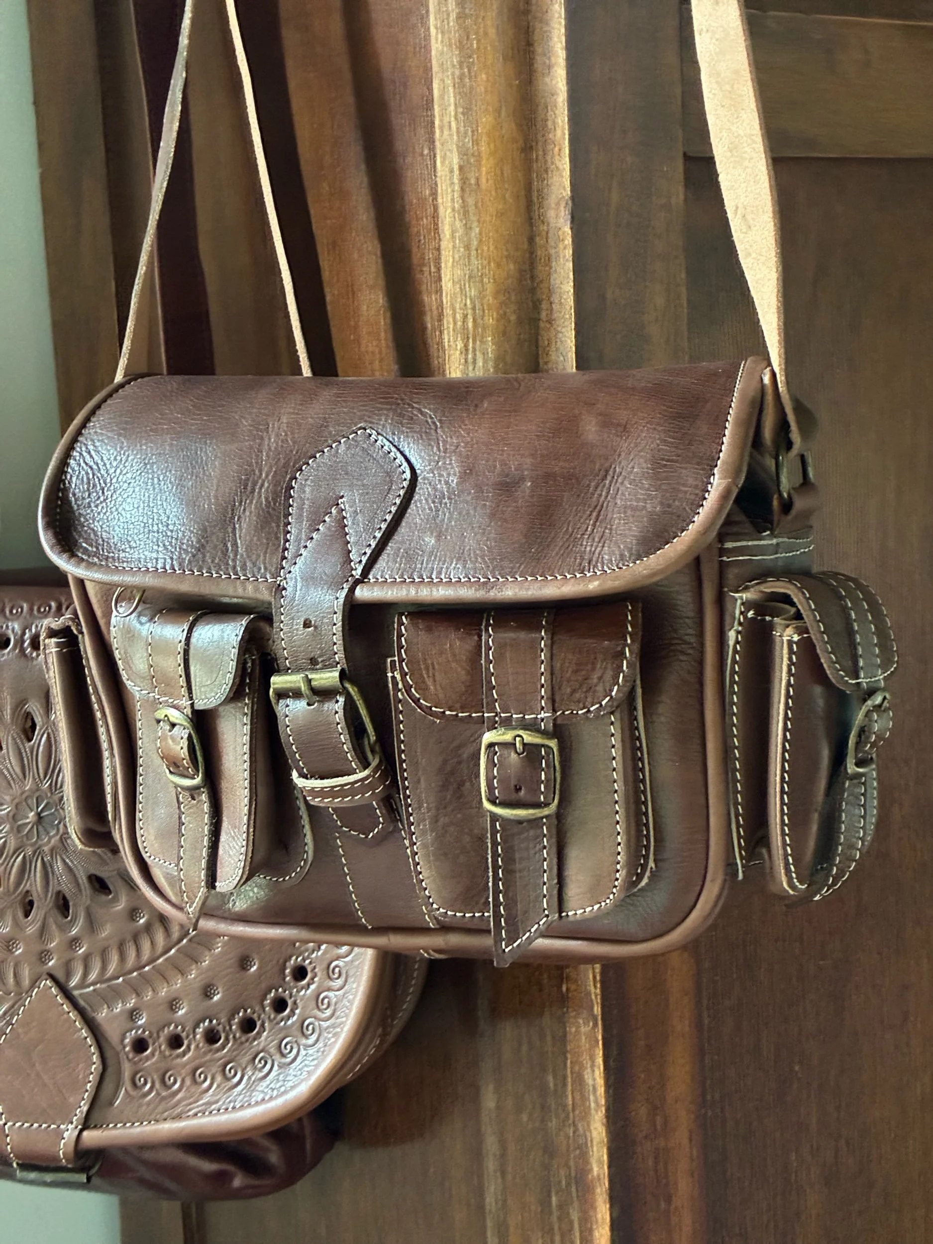 Handmade in Morocco from genuine leather, adjustable cross body strap and multiple pockets for storage.